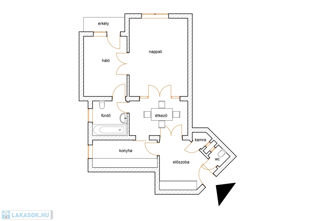 A lakás elrendezése: előszoba, különálló konyha, étkező, nappali, 1 hálószoba, WC, fürdőszoba, erkély.