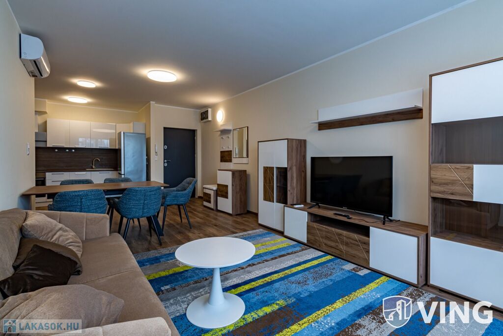 A lakás a képeken látható prémium bútorokkal és gépekkel van esztétikusan berendezve.