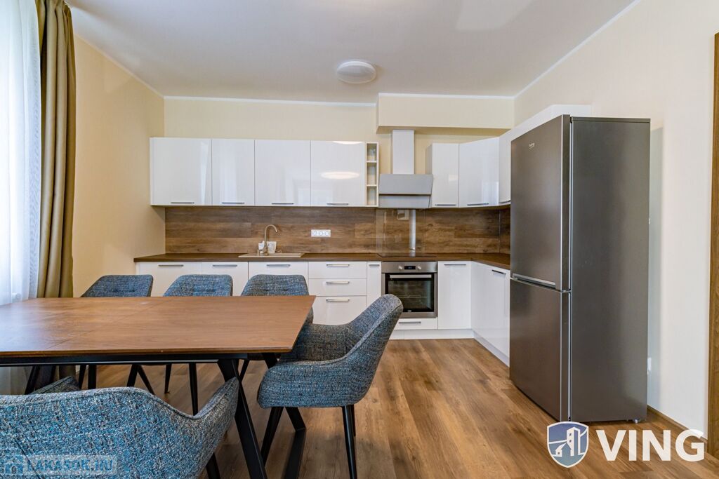 A lakás a képeken látható prémium bútorokkal és gépekkel van esztétikusan berendezve.