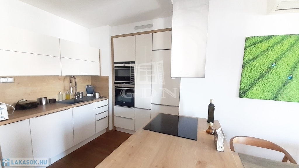 Tölgy svédpadló és prémium kategóriás hideg burkolatok, luxus minőségű szaniterek és konyhabútorok- gépek , világítótestek, dekorációs elemek és bútorok jellemzik az ingatlant, mindez harmonikus egységet alkot, kényelmes, szép életteret biztosítva lakóinak.