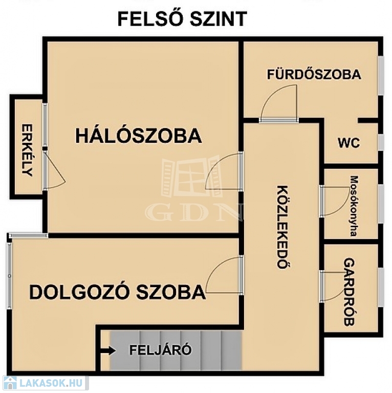 A nappaliból kényelmes, egyedi fénytechnikával felszerelt lépcső vezet fel a felső szintre, ahol egy erkélyes hálószoba, egy dolgozó-, vagy vendégszoba, mosókonyha, gardróbszoba,kádas fürdőszoba és WC található.