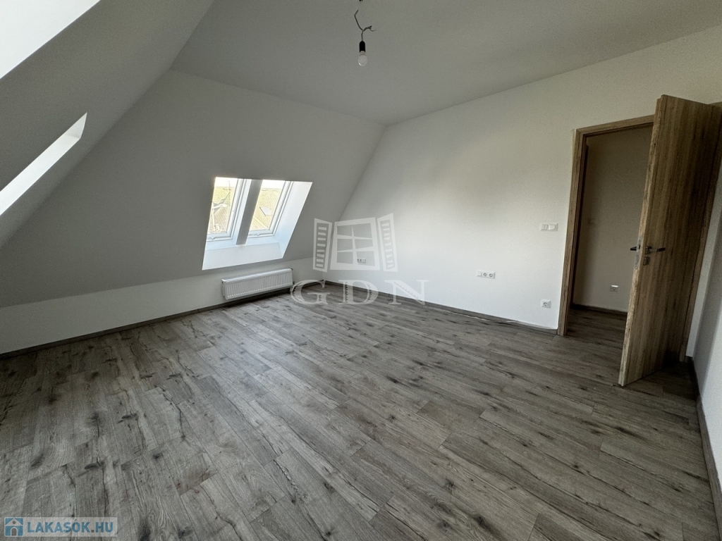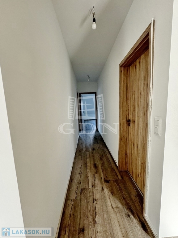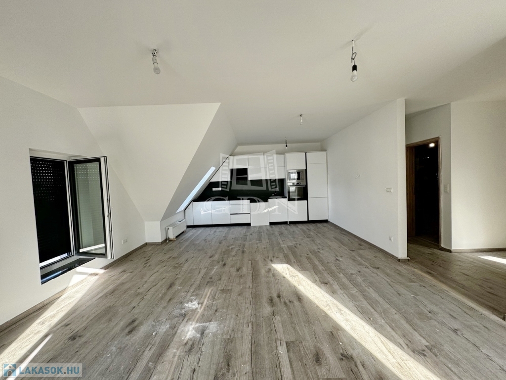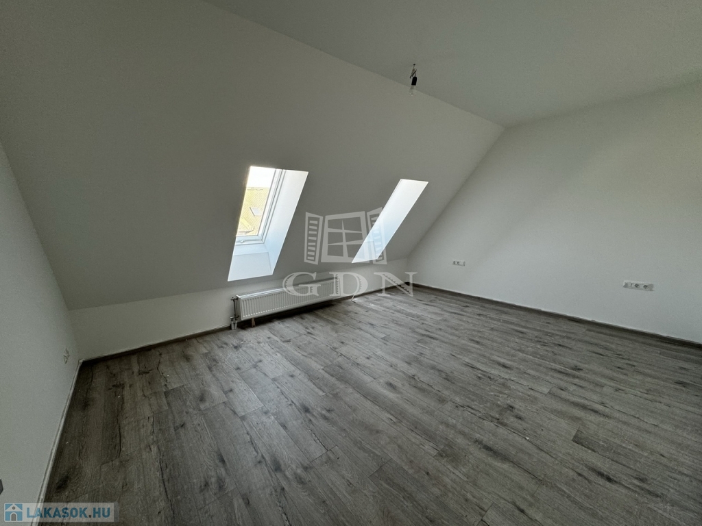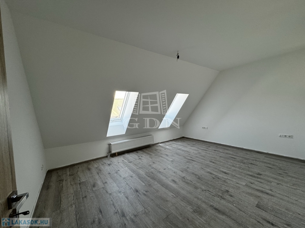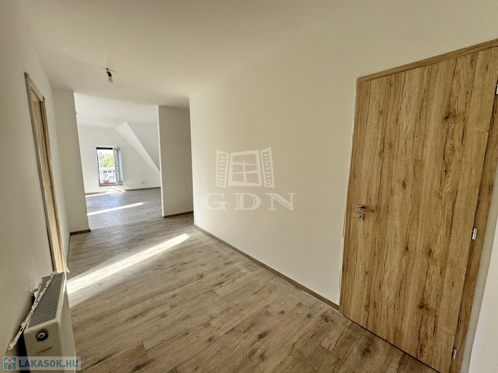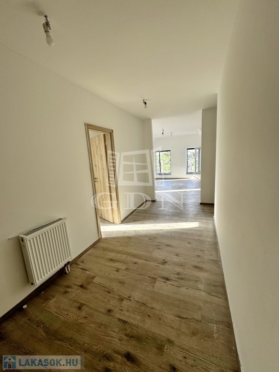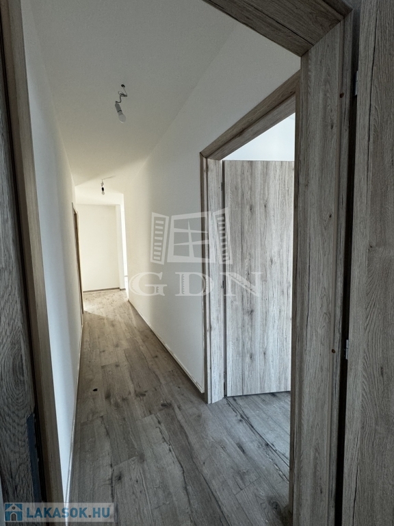 A 120 nm-es lakás egy újépítésű, háromszintes társasház 2. emeletén található, és új lakóját várja. Belépve tágas előtér fogad, innen nyílik a külön WC és az egyik hálószoba, szemben pedig a világos, amerikai konyhás nappali. A közlekedőből jobbra haladva érjük el a fürdőszobát és a további két hálószobát. A fürdőt járólap, a többi helyiséget parketta borítja.