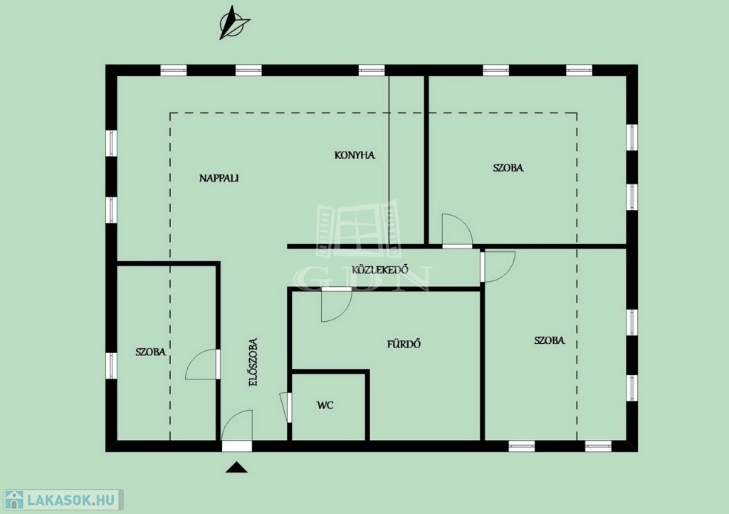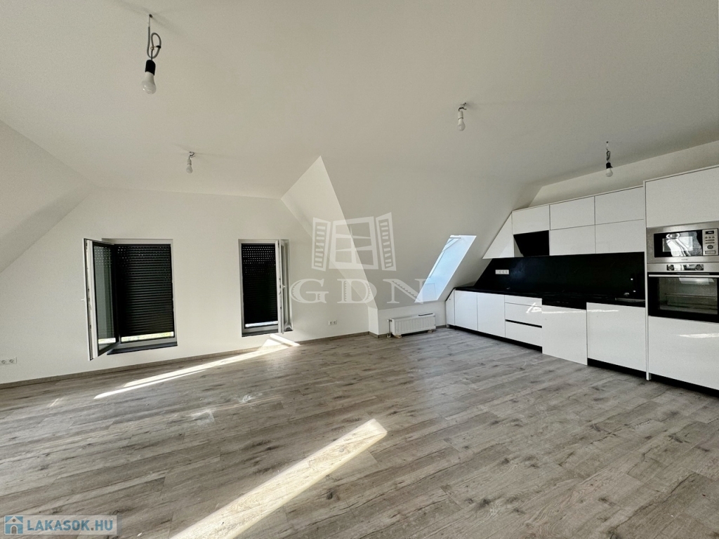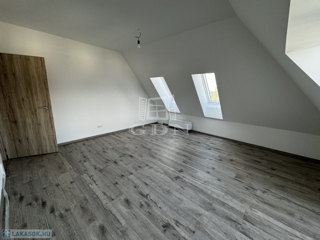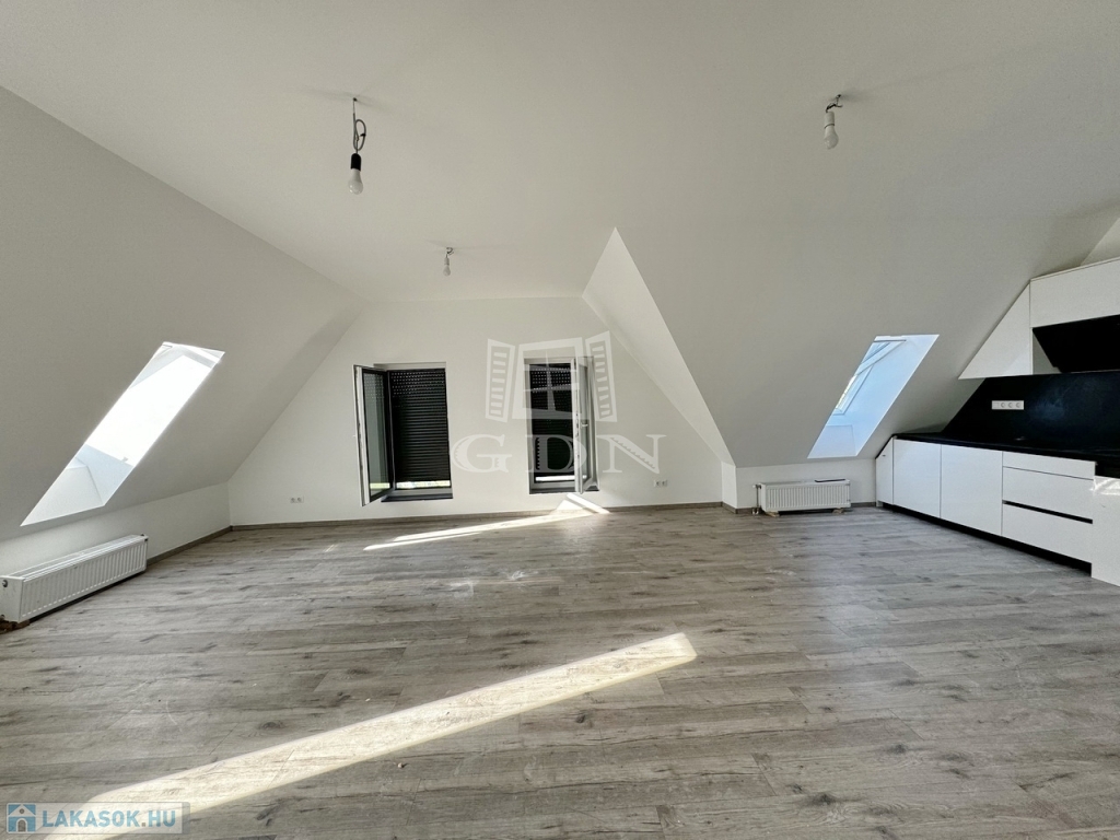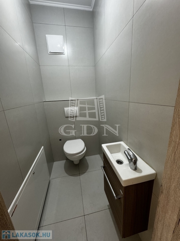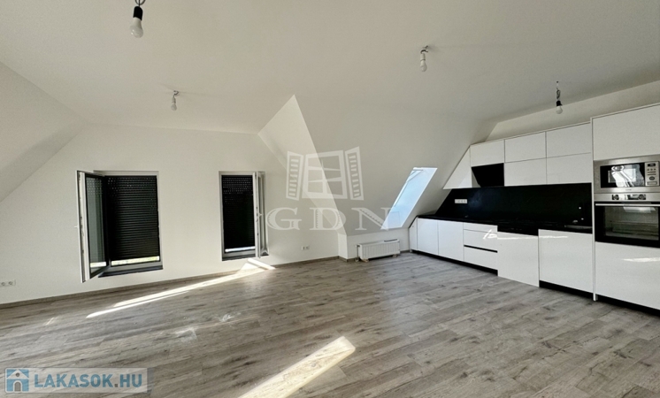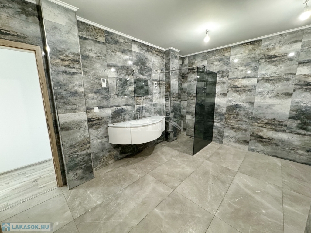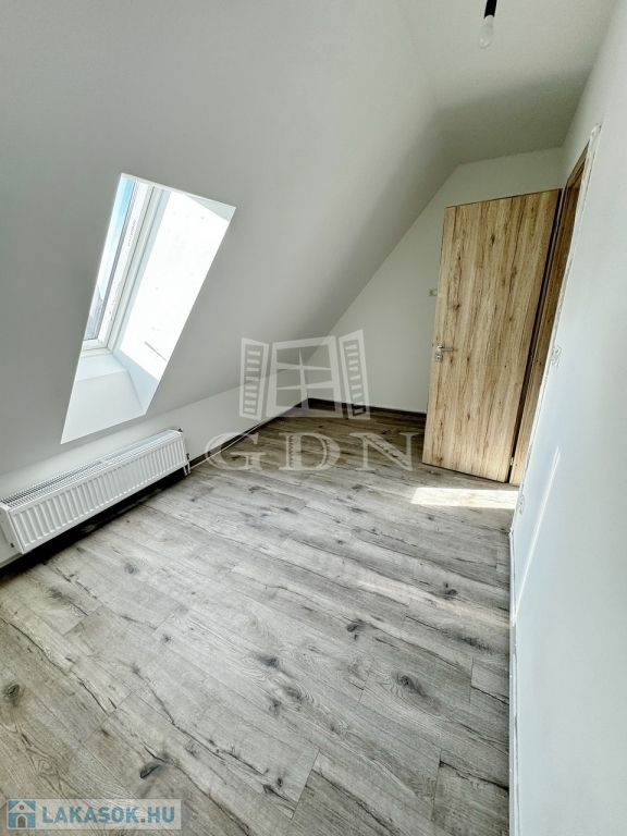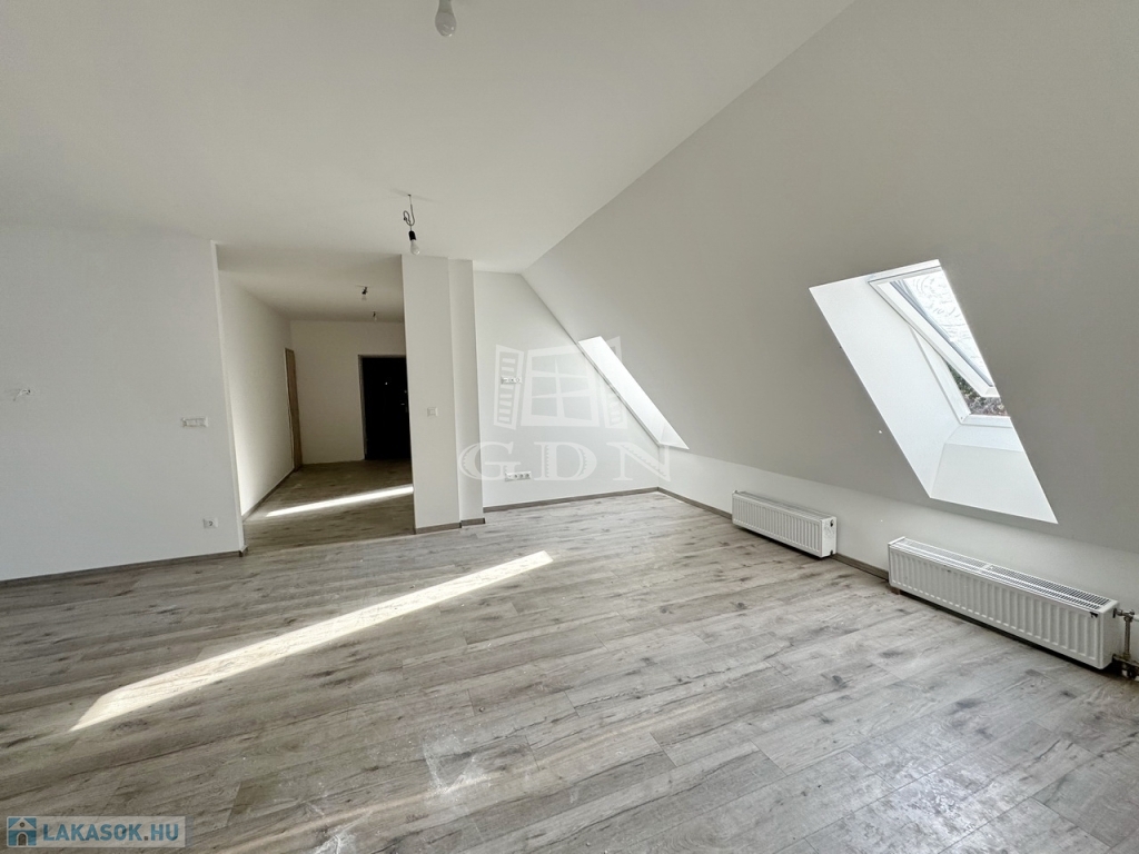 A 120 nm-es lakás egy újépítésű, háromszintes társasház 2. emeletén található, és új lakóját várja. Belépve tágas előtér fogad, innen nyílik a külön WC és az egyik hálószoba, szemben pedig a világos, amerikai konyhás nappali. A közlekedőből jobbra haladva érjük el a fürdőszobát és a további két hálószobát. A fürdőt járólap, a többi helyiséget parketta borítja.