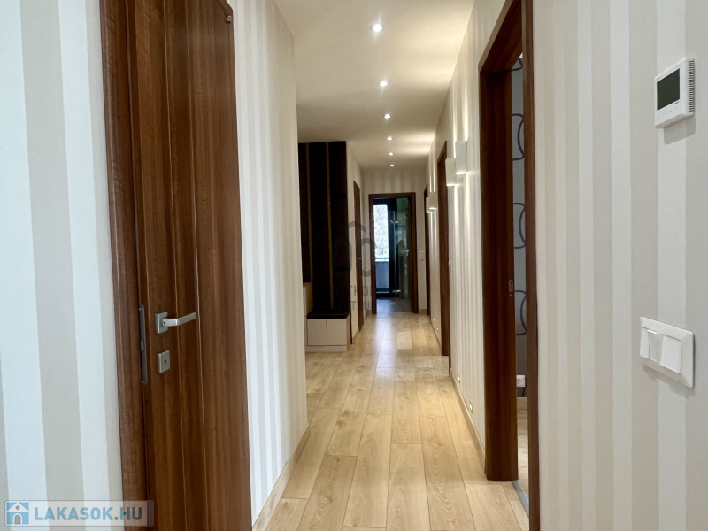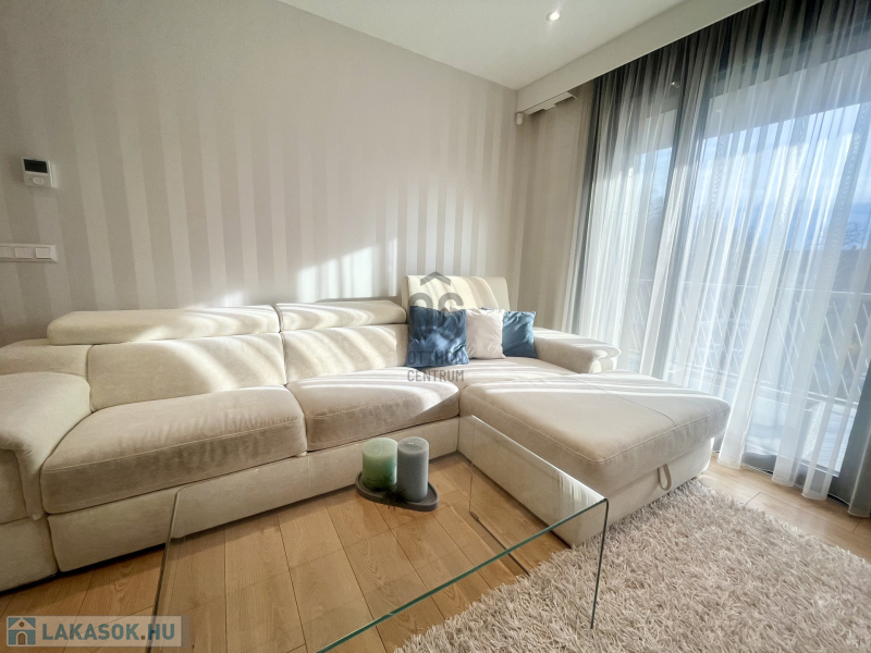 A lakás tökéletes elrendezésű: a központi tér a napfényben úszó, nagyvonalú nappali, mely prémium sarokülővel és LED TV-vel szolgálja a kényelmet. Innen nyílik az elegáns, amerikai stílusú konyha, melyet egyedi tervezésű, teljesen gépesített konyhabútor (főzőlap, sütő, mikró, mosogatógép, hűtő, elszívó, vízlágyító, ozmózis víztisztító) és egy gyönyörű étkező tesz teljessé. Az egyik hálószobában egy nagyméretű, gondosan megtervezett beépített gardrób kapott helyet, a további két szoba pedig igény szerint berendezhető.