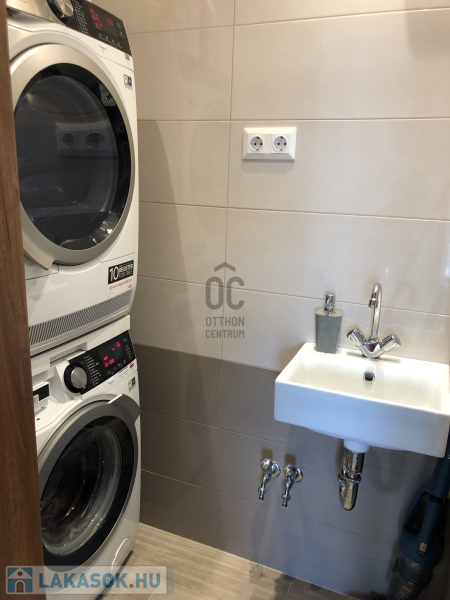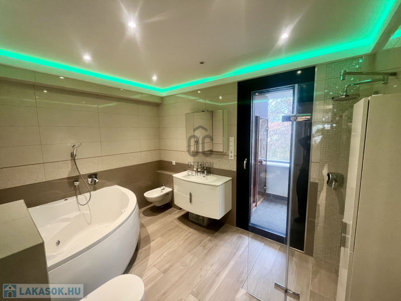 A fürdőszoba szállodai színvonalú: exkluzív burkolatok, magas minőségű szaniterek, sarokkád és külön zuhanyzó biztosítja a tökéletes kényelmet. Különálló WC és praktikus mosókonyha is található a lakásban.