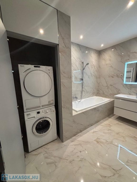 A fürdőszoba ( zuhanyzós és fürdökádas), ahol külön beépített szekrényben "Mille" mosó és szárítógép található! A nyílászárók távirányítós, motoros működtetésű, alumínium redőnnyel felszereltek és szúnyoghálóval ellátottak.