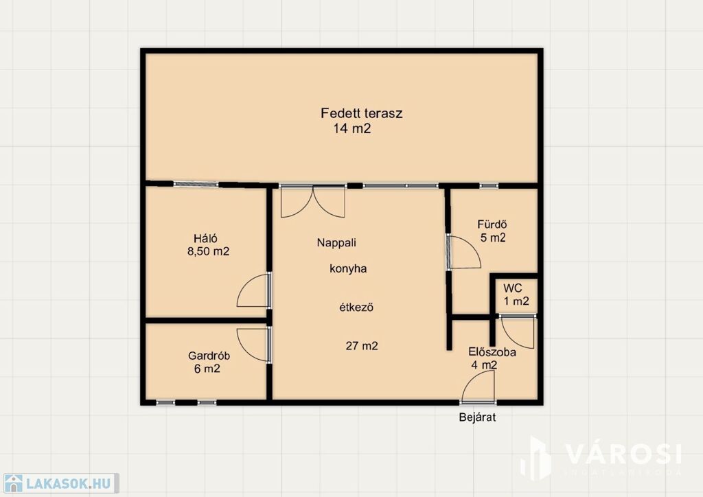 Egy légteres nappali-étkező-konyha 14 m2-es fedett terasszal, fürdőszoba kád és épített zuhany, háló, gardrób szoba, külön WC, előtér, a szélfogóban külön elektromos kazán és vízmelegítő.