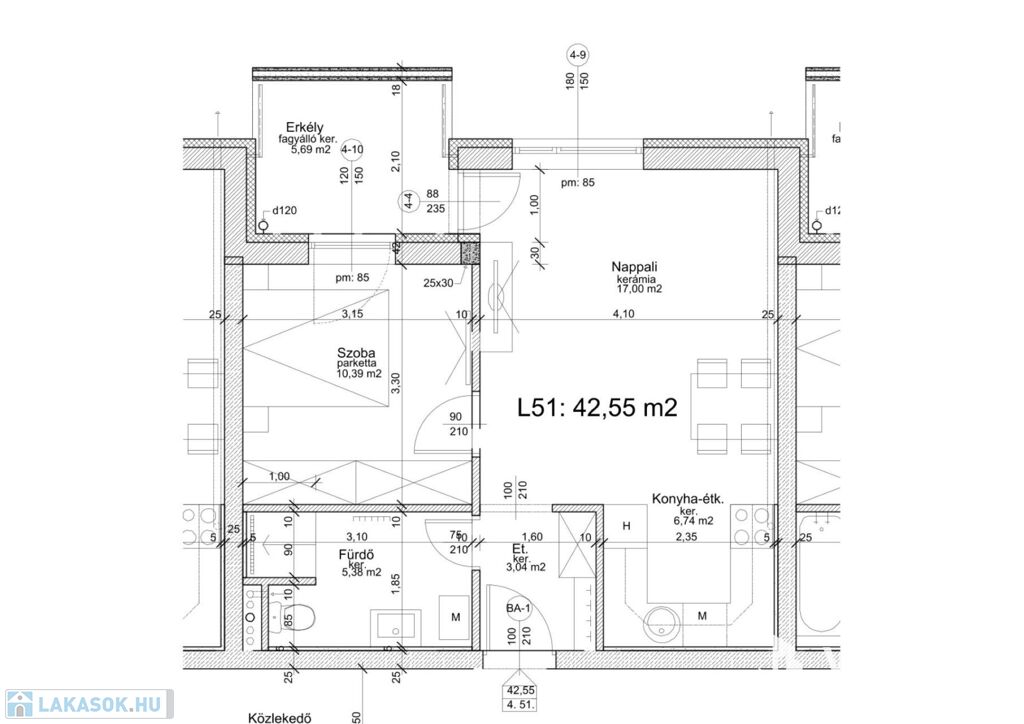 Az ingatlan egy liftes társasház negyedik emeletnén található, alapterülete: 42,55m2, egy nappaliból nyíló 5,69 m2-es erkéllyel.
