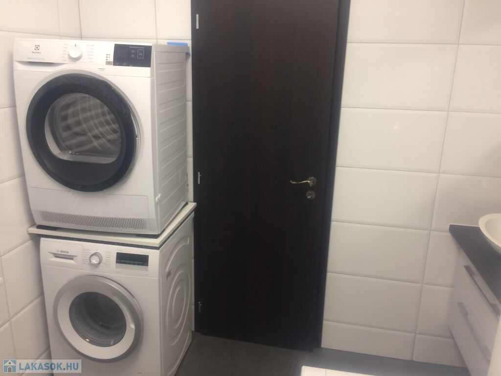 A fürdőszoba zuhanyzóval, káddal, mosó és szárítógéppel felszerelt, külön wc kézmosóval, a konyha elektromos főzőlappal és mosogatógéppel is ellátott.
