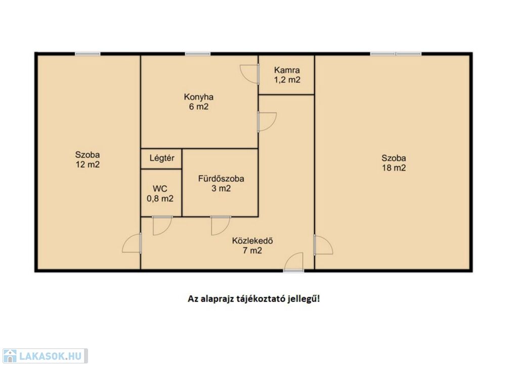 Az ingatlan belső elosztása: közlekedő, 2 szoba, konyha, fürdőszoba, Wc.