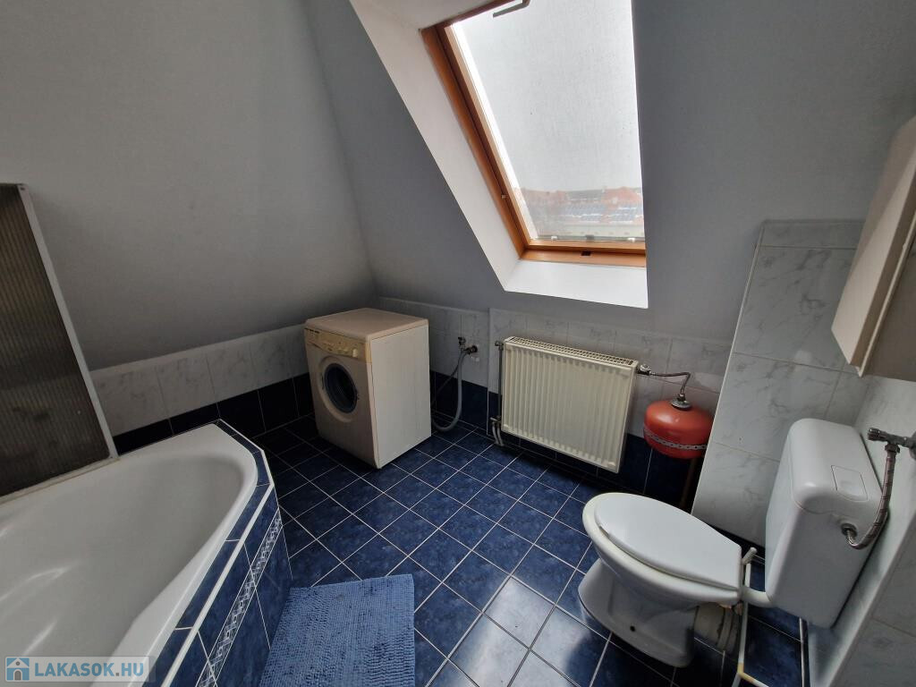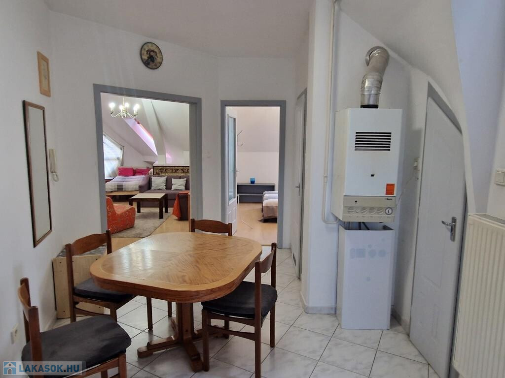 Kaposvár belvárosában, a Teleki utcában kínáljuk bérbevételre ezt a belső kétszintes, 1 + 3 félszobás lakást. Alapterülete 87 m2, a társasház harmadik emeletén helyezkedik el. Alsó szintjén a tágas előtér étkezőként is szolgál, innen nyílik a konyha, a nagyobb méretű nappali szoba, az egyik félszoba, egy zuhanyzós fürdő, valamint egy kis kamra. Innen vezet fel a lépcső a felső szintre, ahol találunk még egy fürdőt sarokkáddal, és két kisebb hálószobát. A lakás tágas, világos, barátságos, elrendezése praktikus. Fűtése saját gázkazánnal megoldott, és légkondi berendezés is van. A lakás a képeken látható bútorzattal és háztartási gépekkel együtt kiadó. Van lehetőség garázst is bérelni, ennek ára plusz 25 EFt havonta. Nemdohányzó bérlőt keresünk hosszabb távra, legalább egy évre, aki a kéthavi bérleti díjnak megfelelő összegű kaució és az első havi bérleti díj kifizetése után beköltözhet. Dohányzás és állattartás tilos.