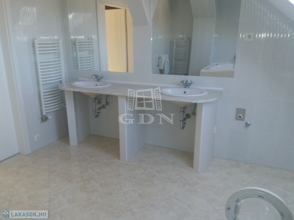 Kényelmes kiosztású lépcsőn jutunk a felső szintre, ahol egy kisebb gyerekszoba, egy méretes hálószoba és egy igazán hatalmas és pazar fürdőszoba került kialakításra. Az itt lakók felfrissülését egy jakuzzi funkciójú kád biztosítja.