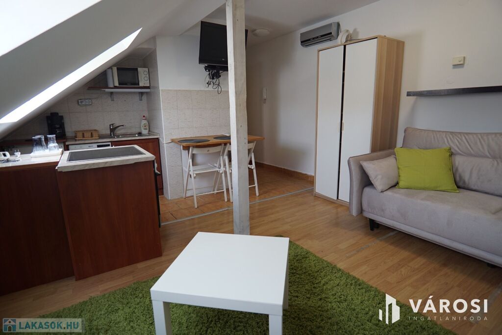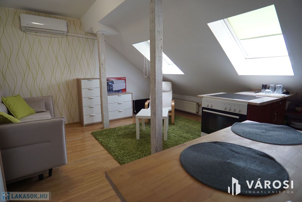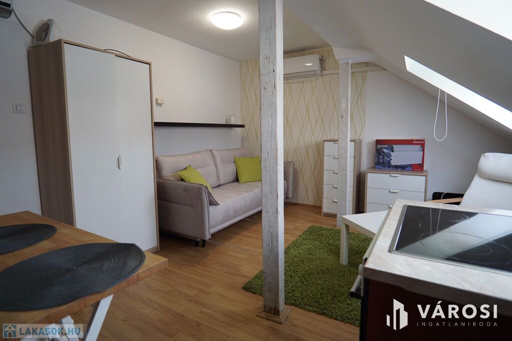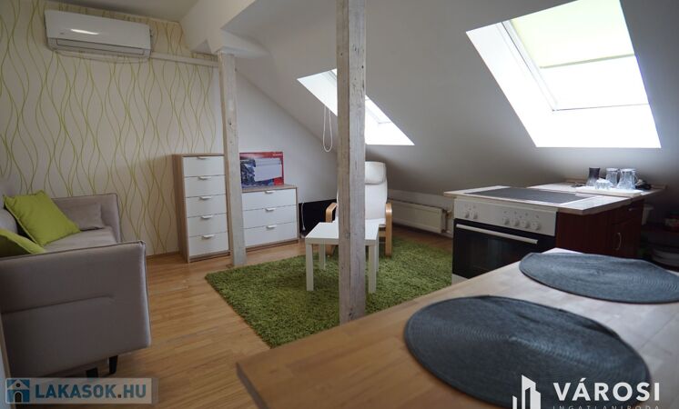 Nagykanizsán, csendes nyugodt környezetben, de mégis a belváros szívében, vált kiadóvá, ez a 21m2-es, teljes gépesítéssel, teljes bútorzattal felszerelt, garzon lakás. Az ingatlan, a 3. emeleten, tetőtérben található. Fűtés: elektromos. Közös költség: 12500 Ft Tájolás: Nyugat. Kisállat nem hozható, a lakásban a dohányzás tilos!