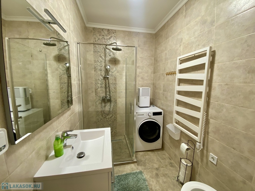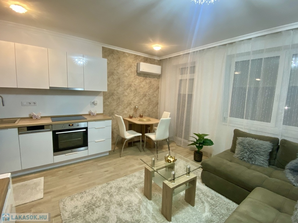 Nyíregyházán, a Belvároshoz közel, 2024-ben átadott társasházban kiadó egy 1 hálószobás + nappalis, első emeleti, klimatizált, igényesen bútorozott és teljesen gépesített lakás.