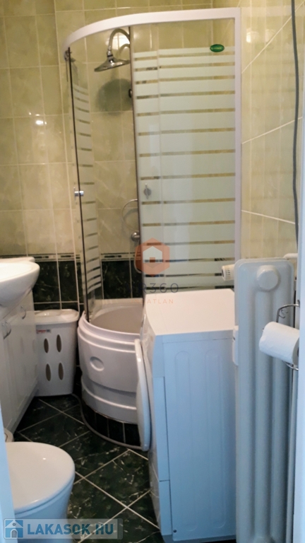 Fürdőszoba zuhanykabinnal és mosógéppel