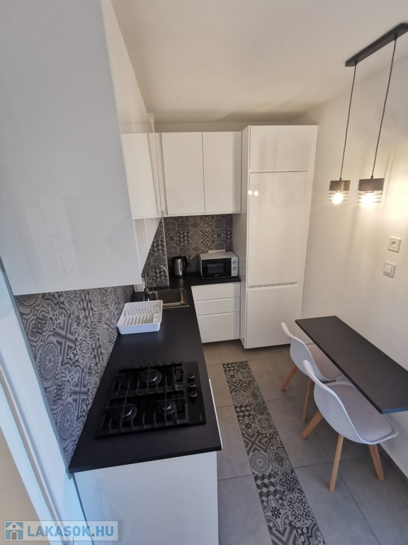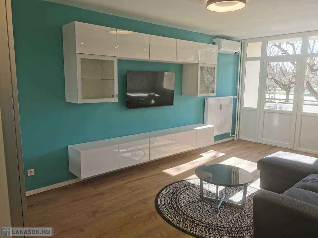 Lakás bútorozott, gépesített, 4K smart TV-vel felszerelve.