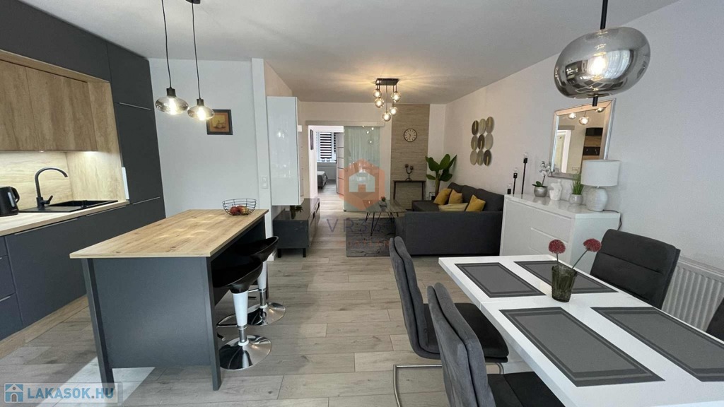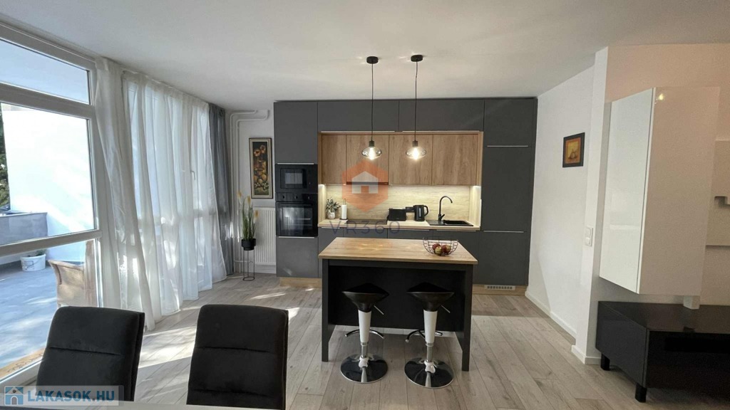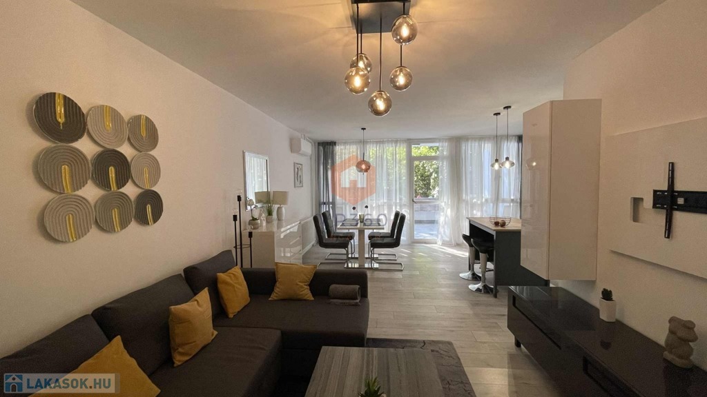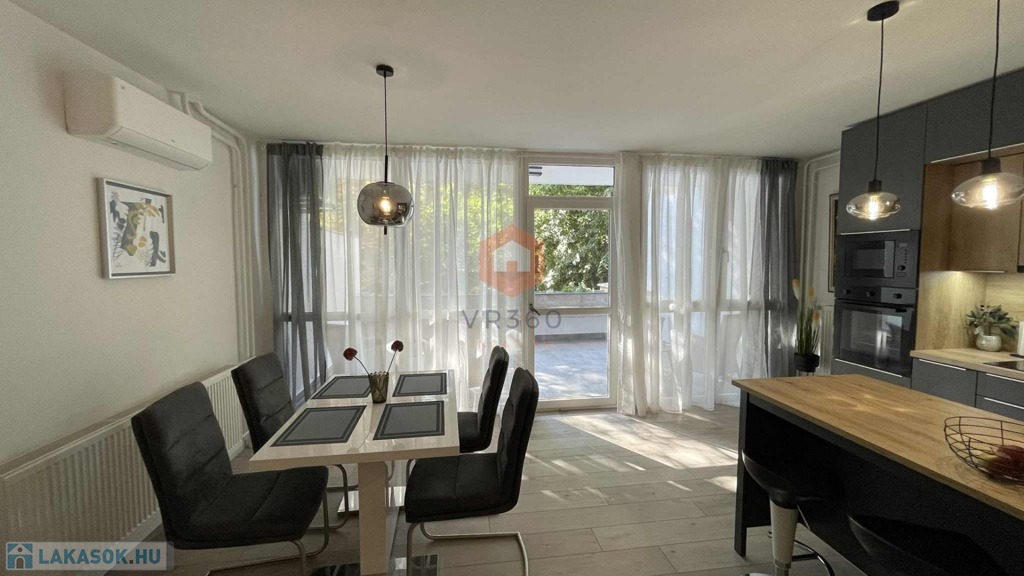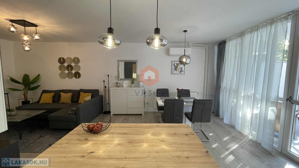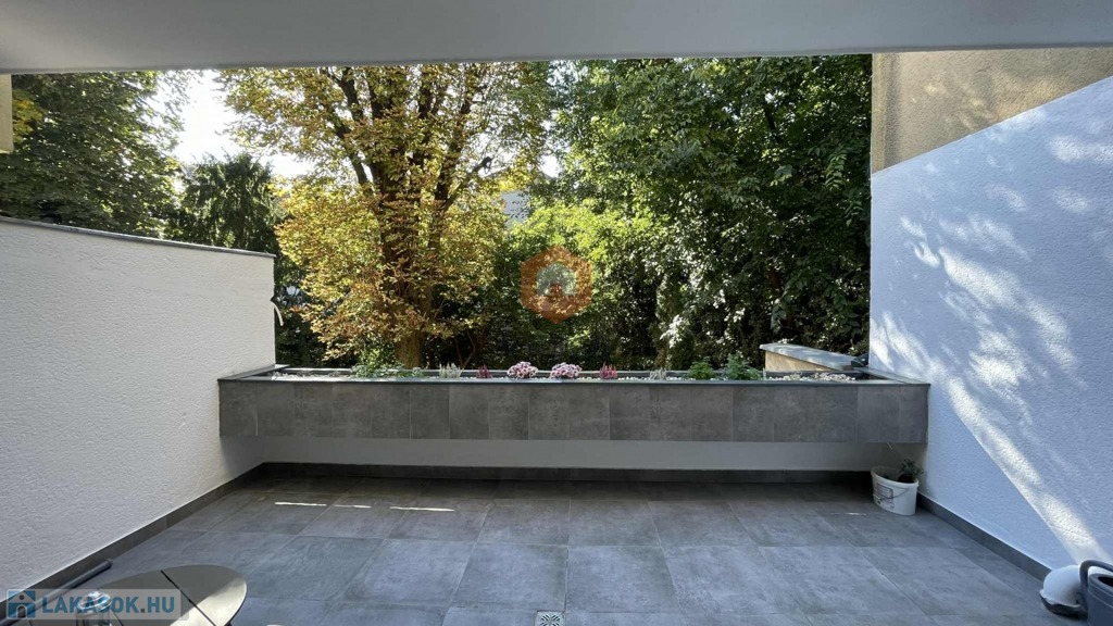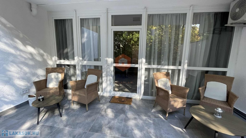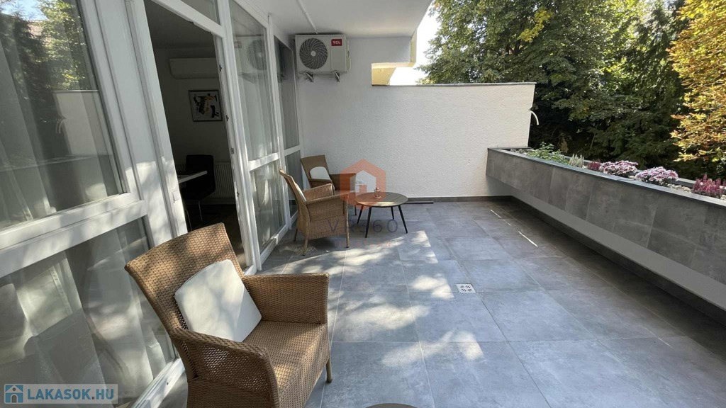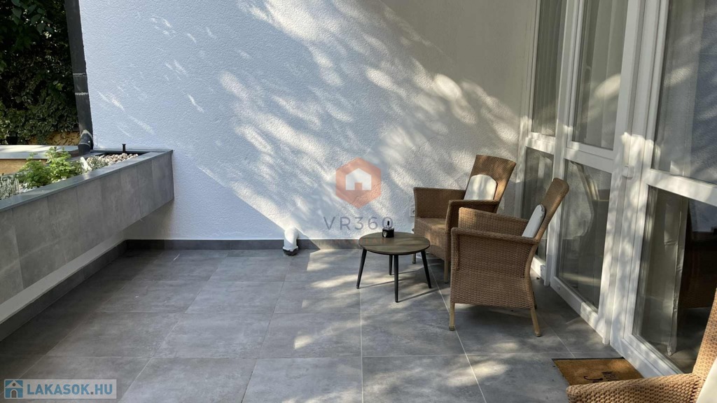 72 m2 földszinti elhelyezkedés + 20 m2-es déli fekvésű terasz, igényes kerti bútorokkal, nyugodt, csendes környezetben!