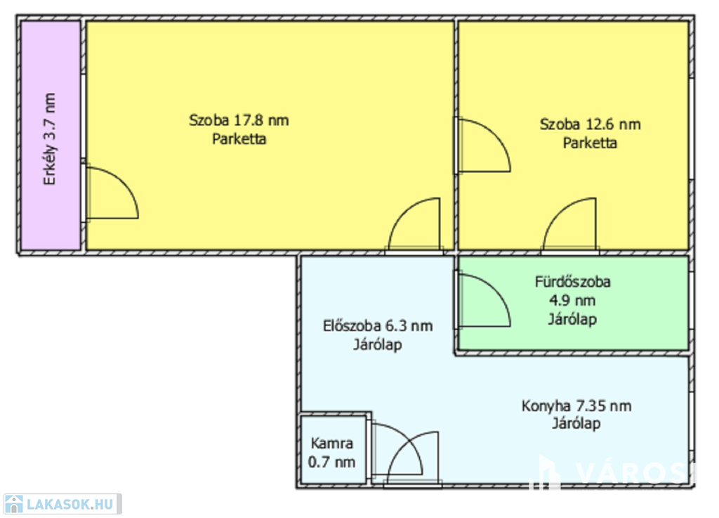 A lakásban 2 szoba, konyha, kamra, előszoba, fürdőszoba, erkély található.