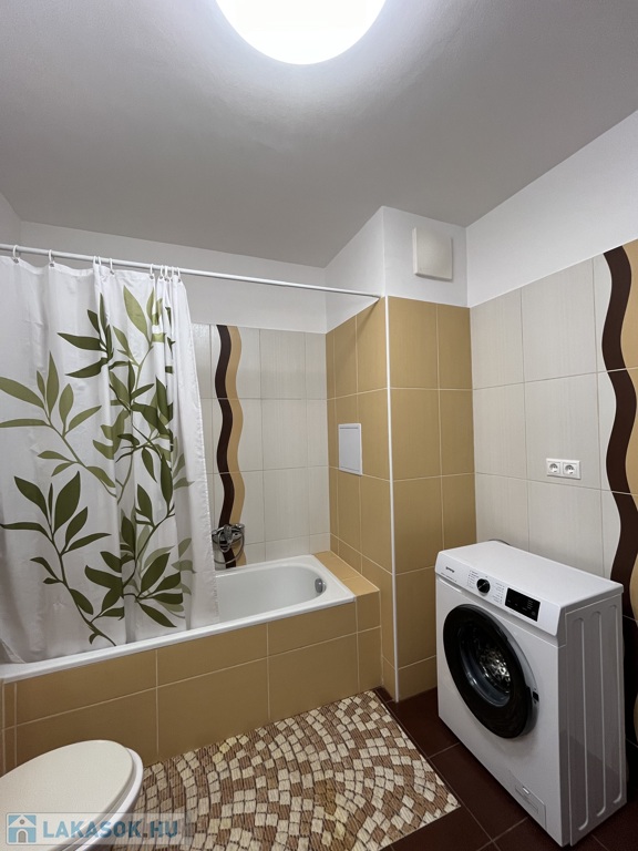 A lakásba lépve egy előszobába jutunk, melyből balra nyílik a káddal és mosógéppel ellátott fürdőszoba.