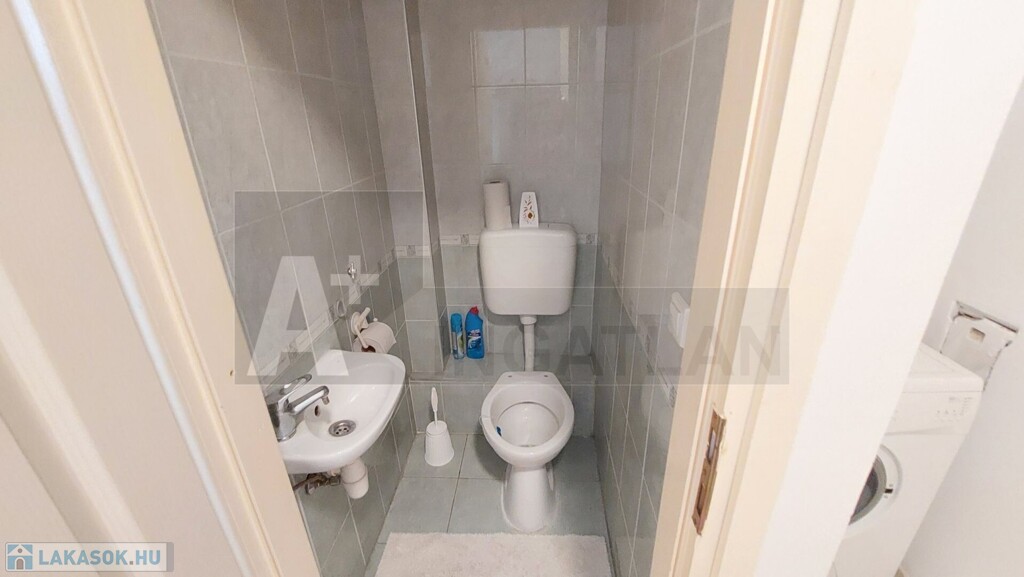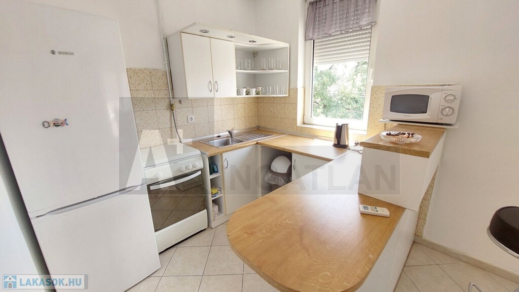 A lakás berendezett és gépesített (hűtő, mikró, mosógép).