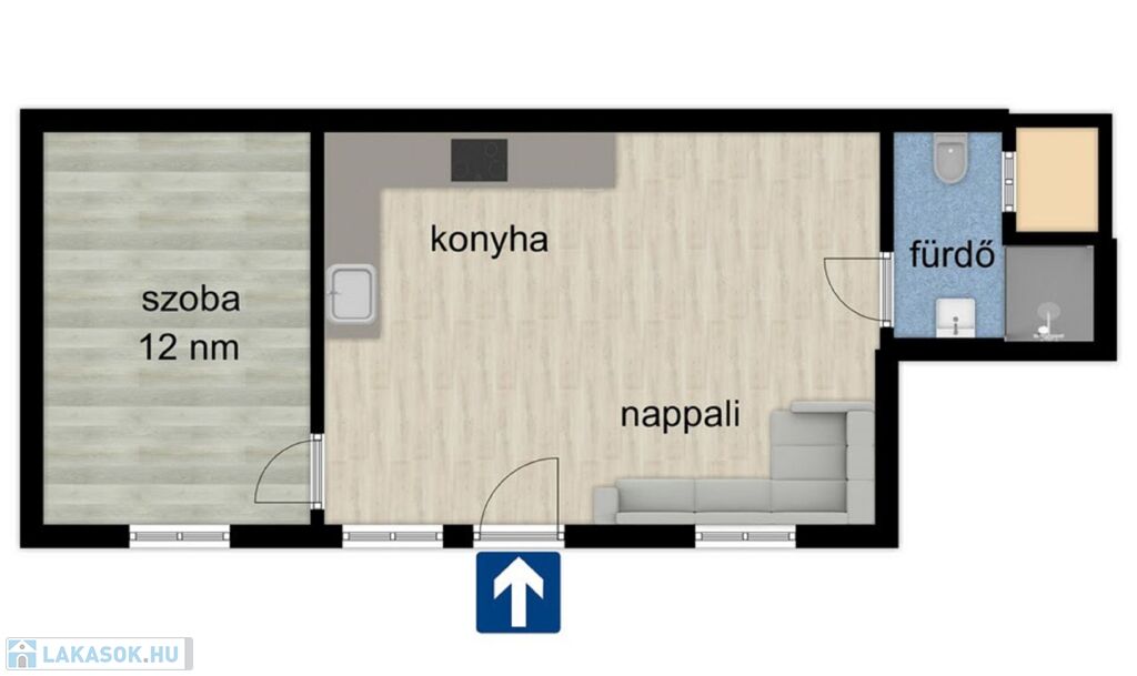 - Amerikai konyhás nappali, hálószoba, fürdő.