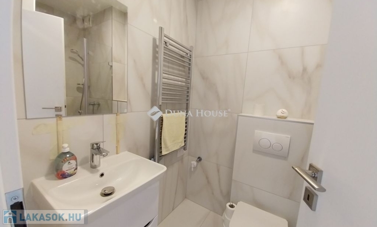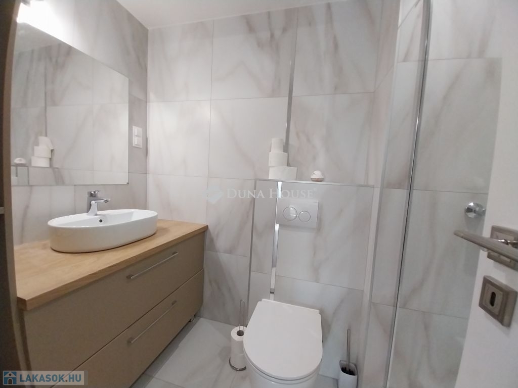 A fürdőszobába zuhanykabin került beépítésre, a mellékhelyiség nem szeparált.