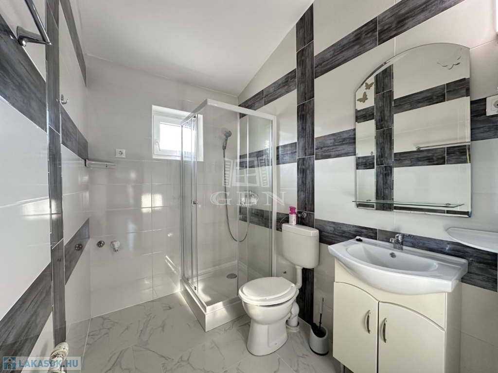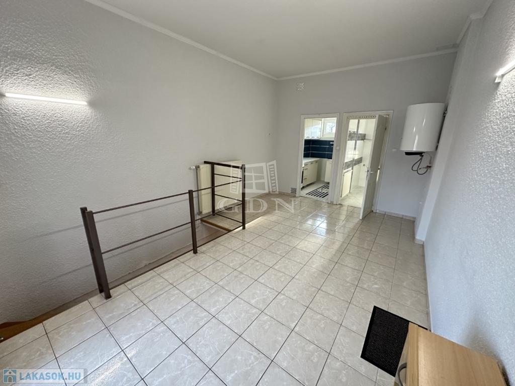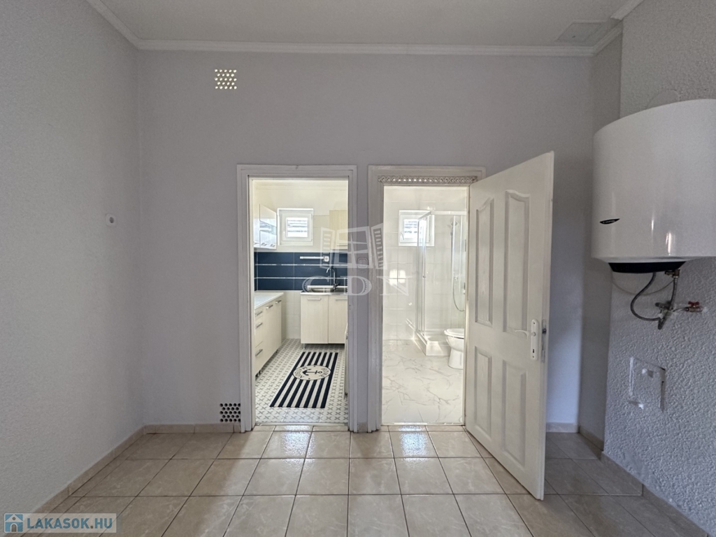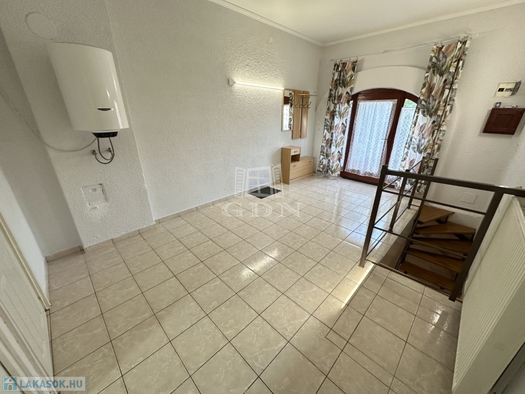 A nappali burkolat járólap, a szoba szőnyeggel, a zuhanyzós fürdő és a konyha járólappal burkolt. A használati meleg vizet villanybojler biztosítja