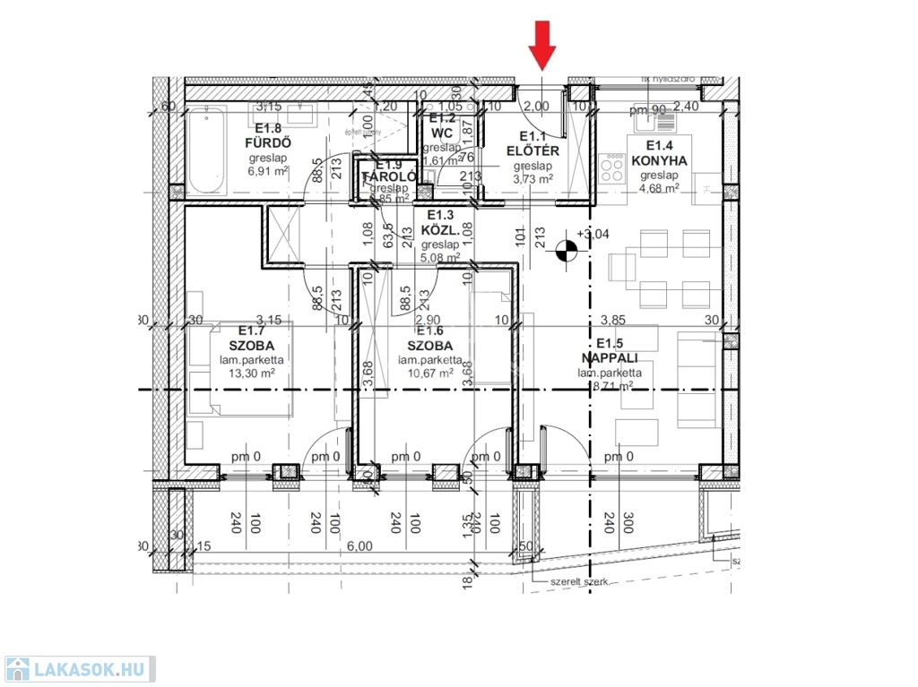 Ez a modern lakás 2 hálószobával, tágas nappali-étkező-konyhával, valamint külön WC-vel és fürdőszobával (WC, kád és zuhanyzó) rendelkezik.