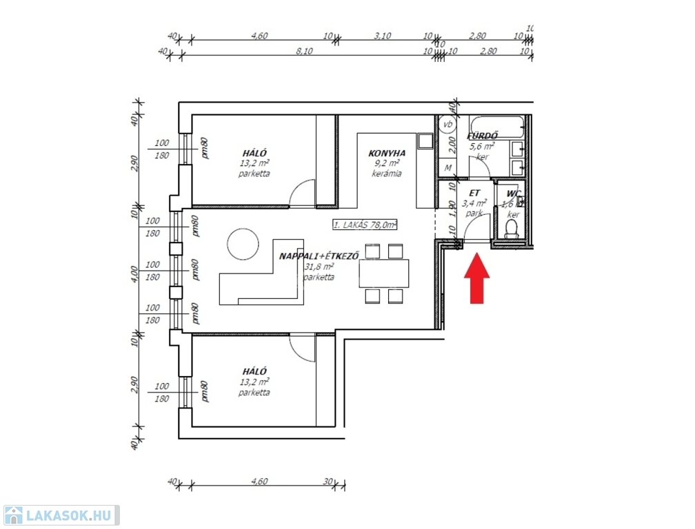 - amerikai konyhás nappali + 2 szoba (13,2 nm és 13,2 nm)