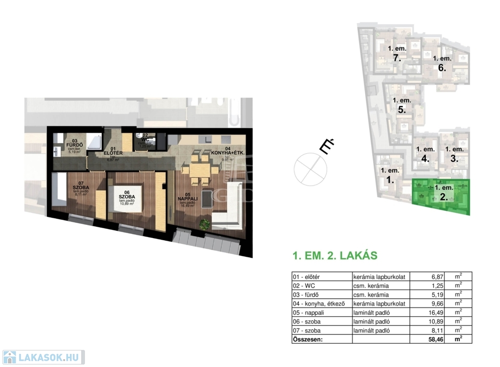 - amerikai konyhás nappali + 2 szoba (10,89 nm ; 8,11 nm)