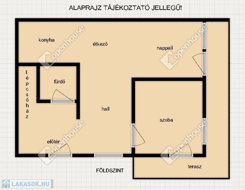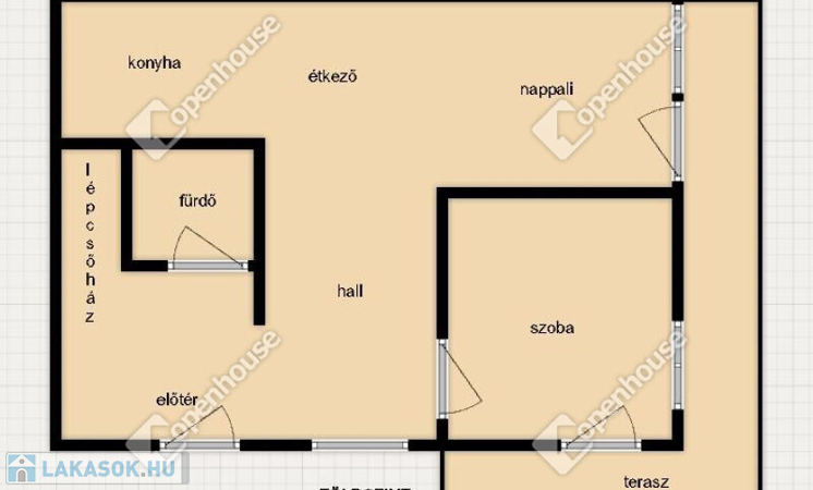 - helyiségek földszinten: nappali-konyha-étkező, előszoba-lépcsőház, fürdőszoba, hálószoba, terasz