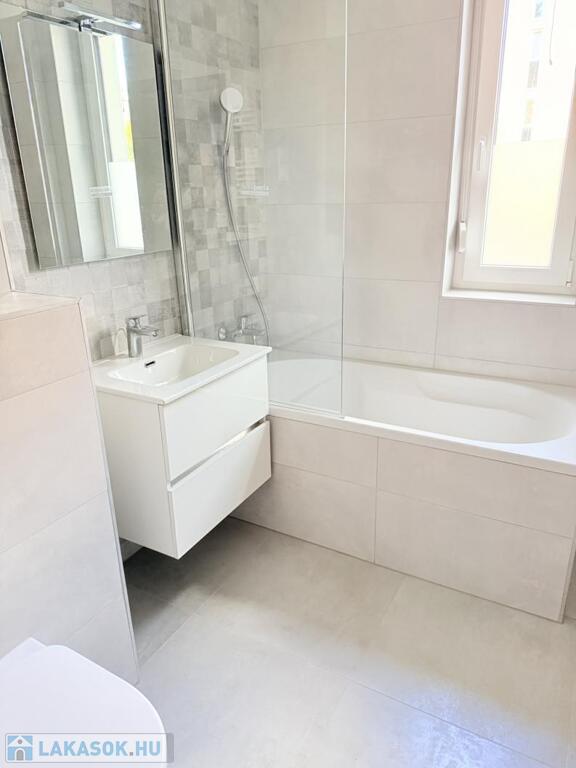 A burkolatok és szaniterek modern, igényes megjelenést biztosítanak, így a lakás fiatalos, letisztult arculattal rendelkezik.