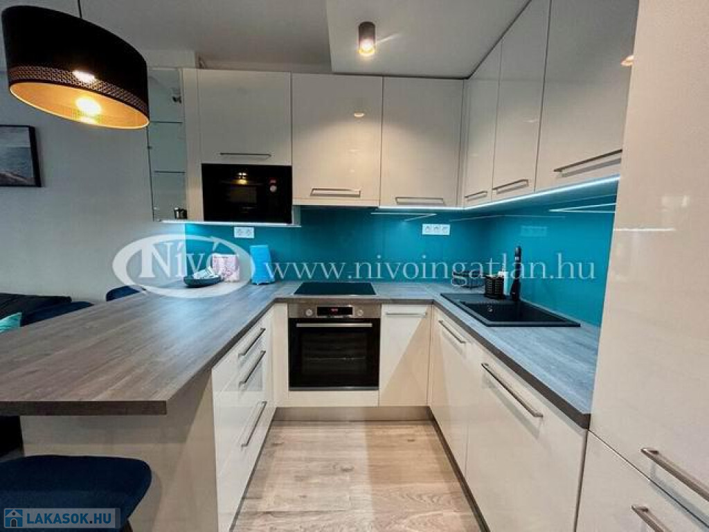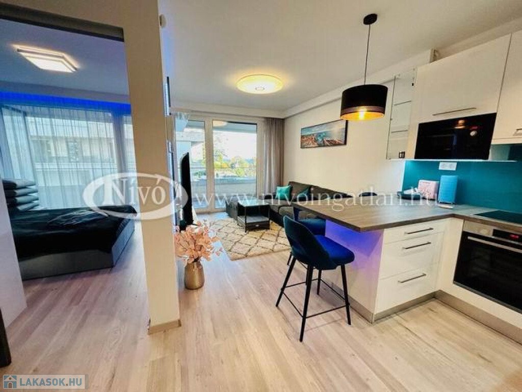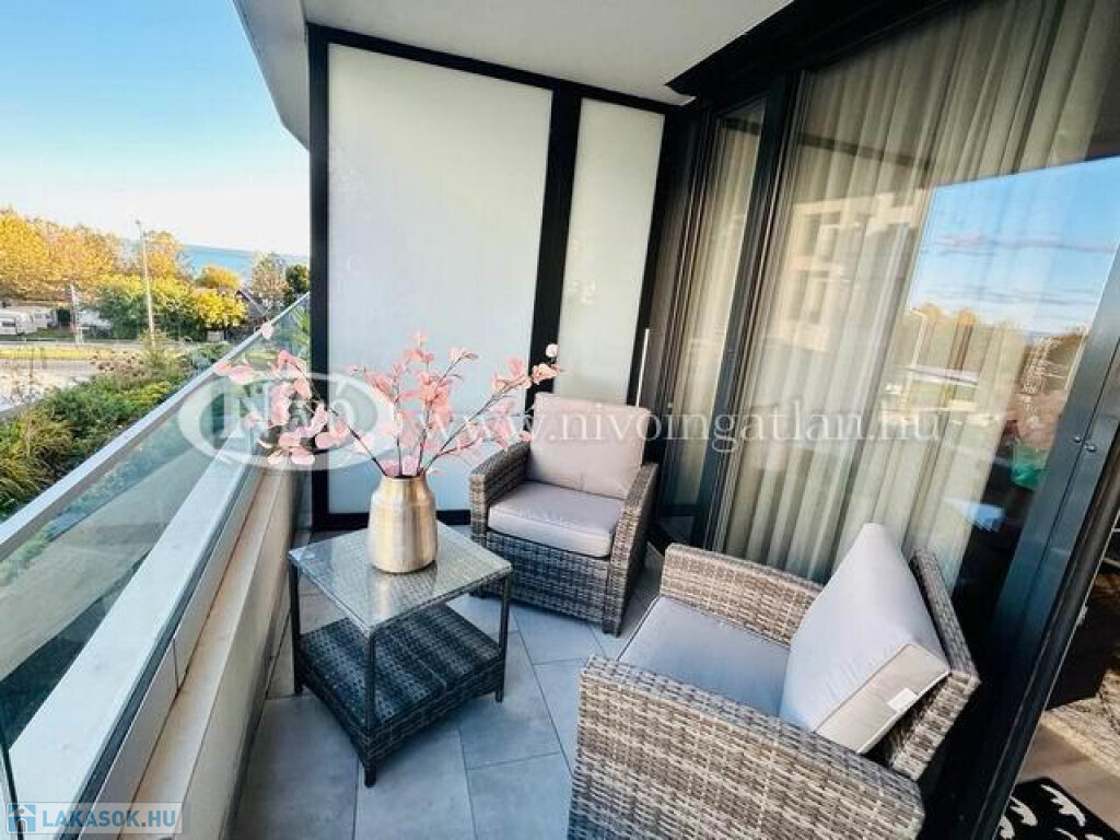 Alsóörsön, partközeli, Balatoni-rálátással, igényes, exkluzív, medencés, 2022-ben épült liftes társasházban, tégla lakás nagy méretű terasszal és teljes, komplett berendezéssel eladó.