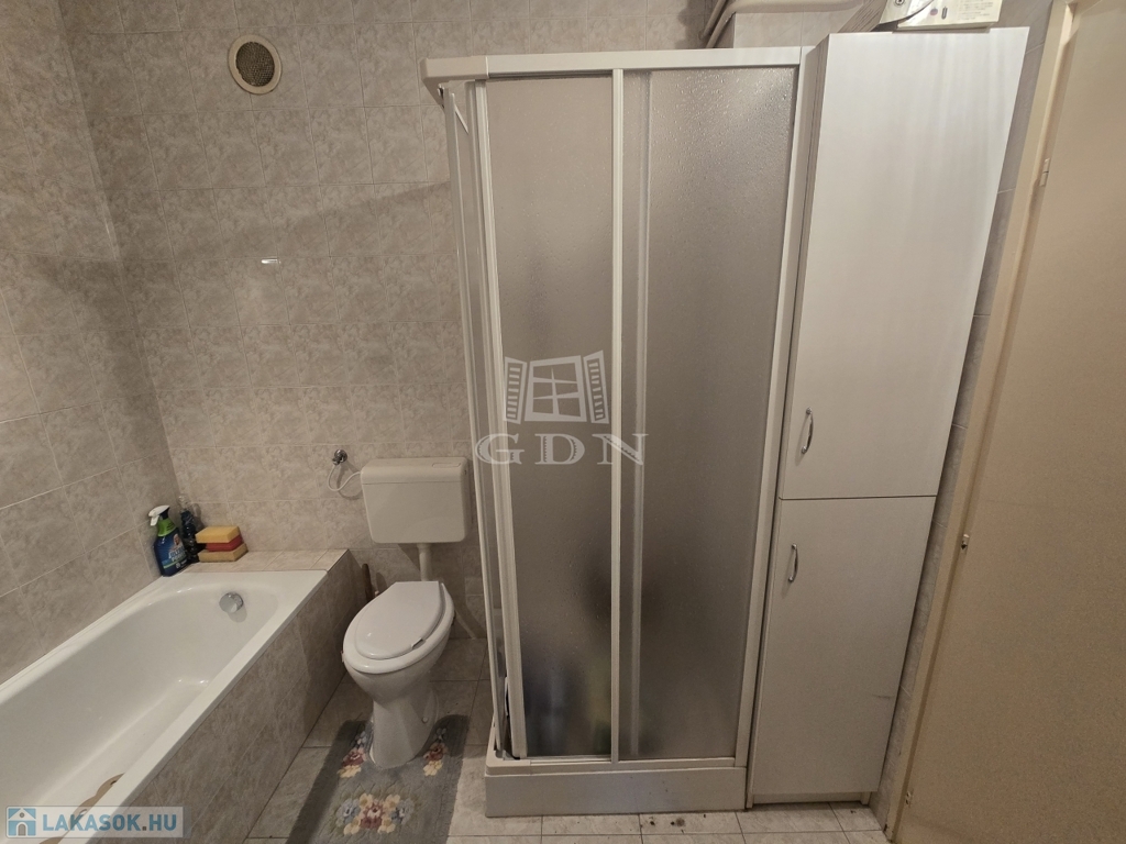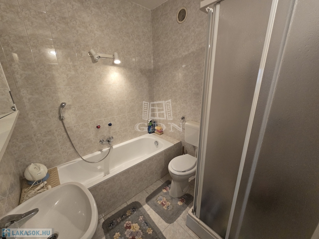 - Nagy méretű fürdőszoba káddal és zuhanyzóval, ahol a WC is helyet kapott.