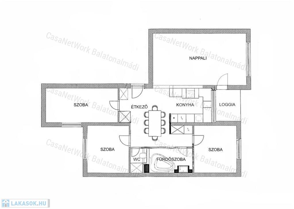 - Ideális kialakítású terek: napfényes nappali, összeköttetésben a konyha-étkezővel, három hálószoba, fürdőszoba, toalett és loggia