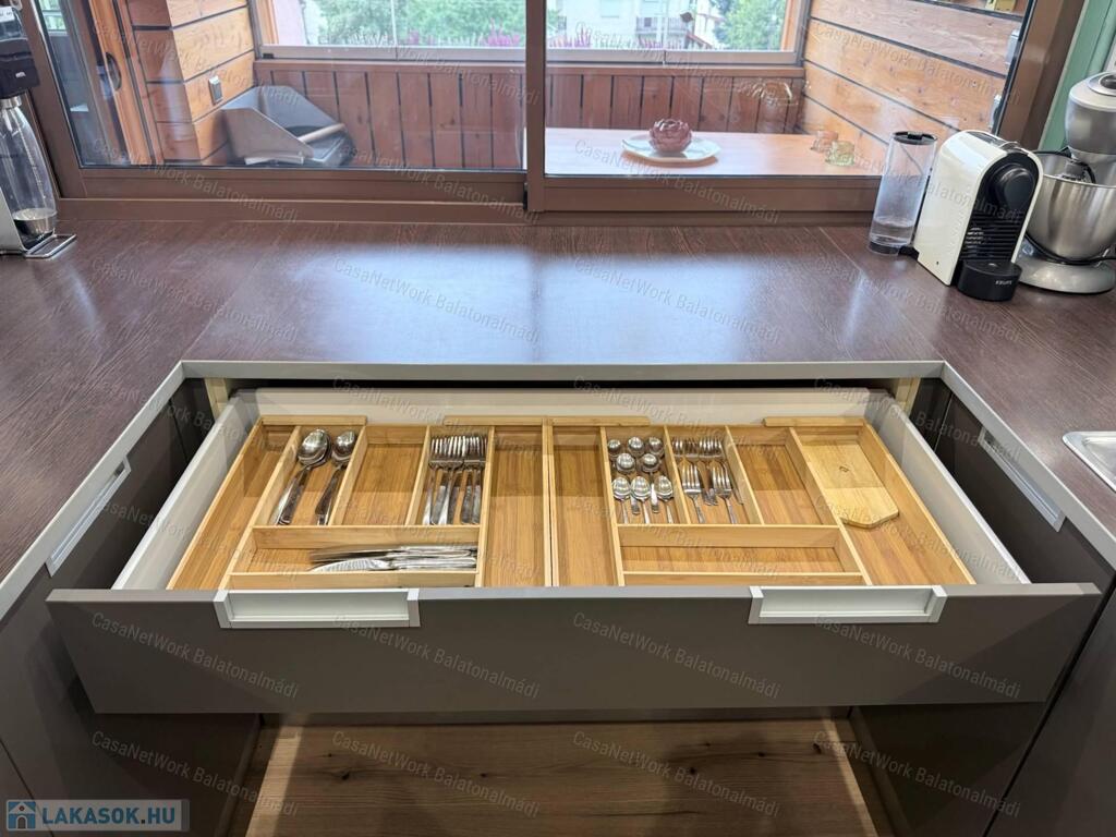 zöldségmosó, üvegburkolat az alsó és felső szekrények között, tolóablak a loggia irányába.