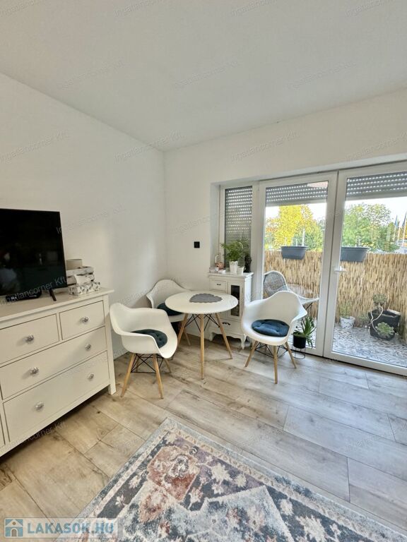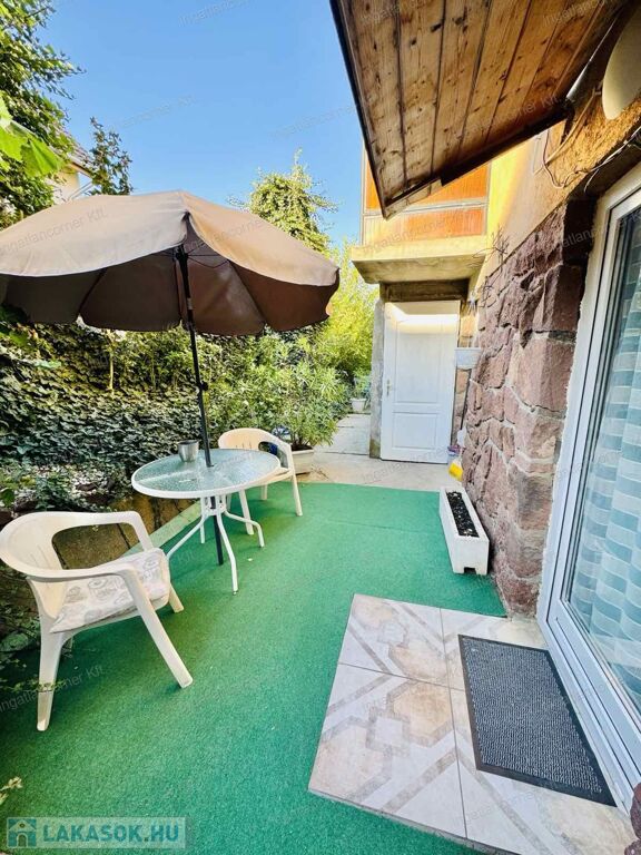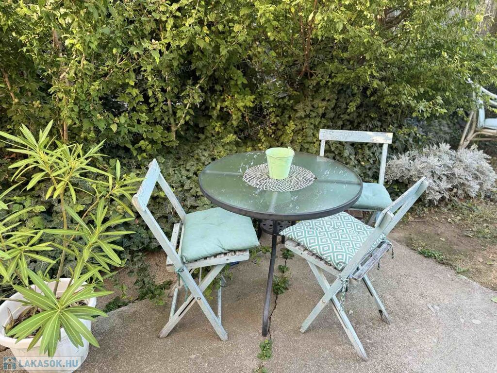 A telekre (illetve a telek előtt is) akár több gépkocsinak is lehetősége van beállni, jelenleg kint megoldott a parkolás. A kert nagyon hangulatos, intim. A kiadott lakrész előtt 20 nm terasz, 2 nm tároló, illetve a fodrászat előtt is szépen parkosított az udvar.