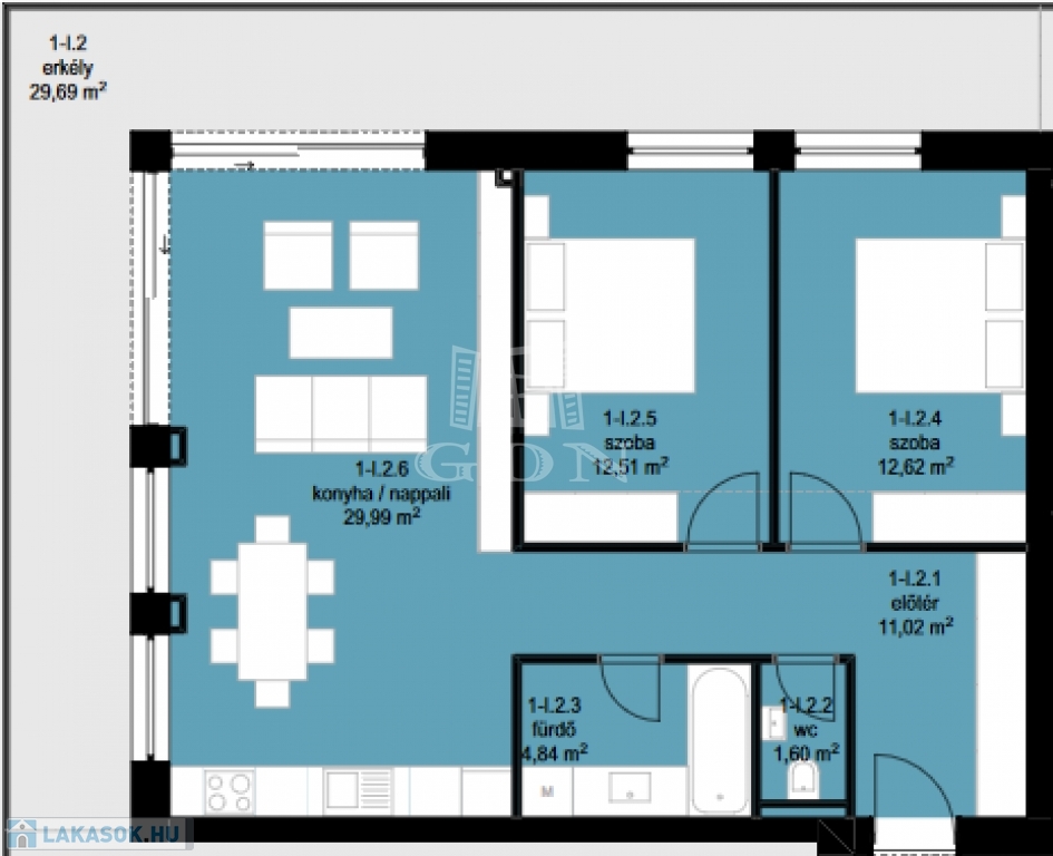 A LAKÁS az első emeleten található. 73 nm lakótér, 30 nm terasz. Amerikai konyhás nappali, 2 hálószoba, fürdőszoba, WC.