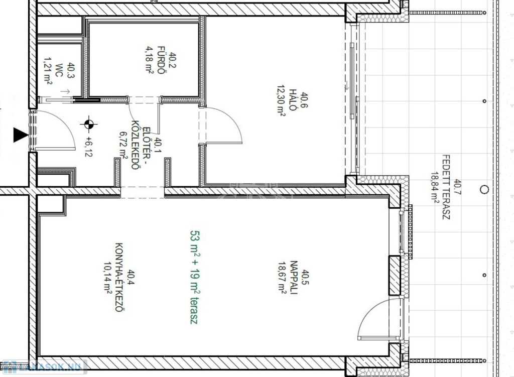 Ez a lakás nappali+1 hálós, 53nm alapterületű+ tartozik hozzá egy 19nm-es fedett terasz is.