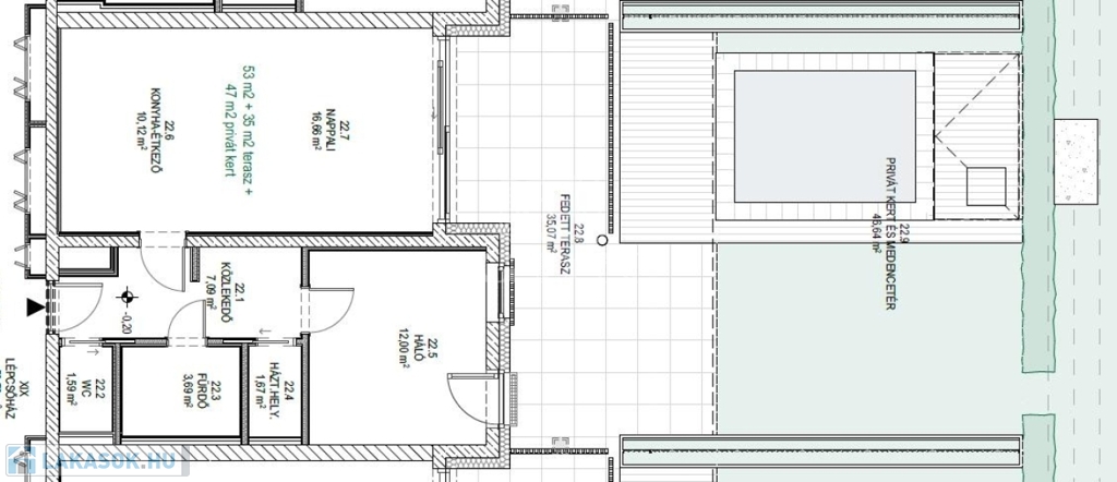 Ez a lakás nappali+1 hálós, 53nm alapterületű+ tartozik hozzá egy 35nm-es fedett terasz és 47nm privát kert is.