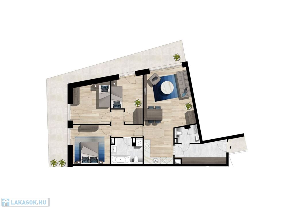 A lakás az 1. emeleten található, nappali+3 hálószobás, 86,87 m²-es. Minden szobából közvetlenül megközelíthető a 31,72 m²-es terasz.