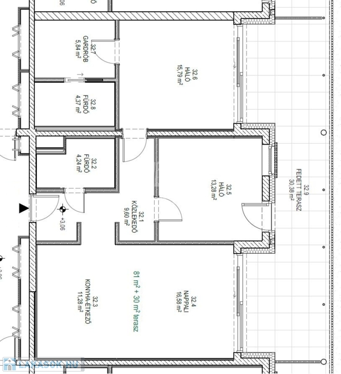 Ez a lakás nappali+2 hálós+ gardrób szobás, 81nm alapterületű+ tartozik hozzá 30nm fedett terasz is.