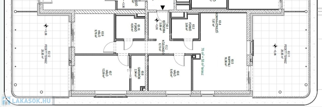 Ez a lakás nappali+3 hálós, 76nm alapterületű+ tartozik hozzá két (29nm+29nm) összesen 58nm fedett terasz is.