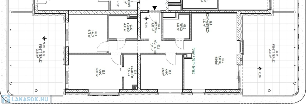 Ez a lakás nappali+3 hálós, 76nm alapterületű+ tartozik hozzá két (29nm+29nm) összesen 58nm fedett terasz is.