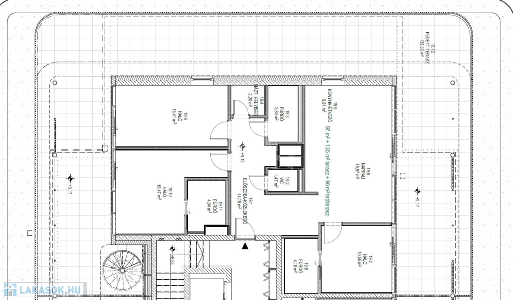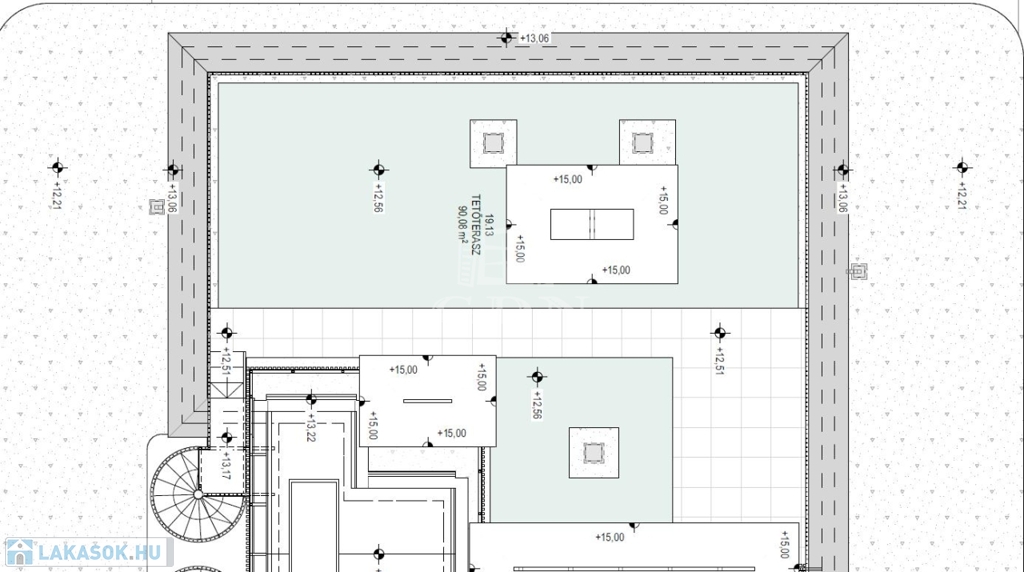 Ez a lakás nappali+3 hálós, 97nm alapterületű+ tartozik hozzá a lakást körülölelő 135nm-es fedett terasz és a tetőszinten található 90nm-es zöld terasz is.