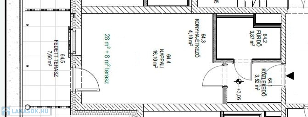 Ez a garzonlakás 28nm alapterületű+ tartozik hozzá egy 8nm-es fedett terasz is.