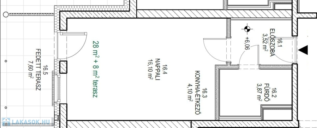 Ez a garzonlakás 28nm alapterületű+ tartozik hozzá egy 8nm-es fedett terasz is.