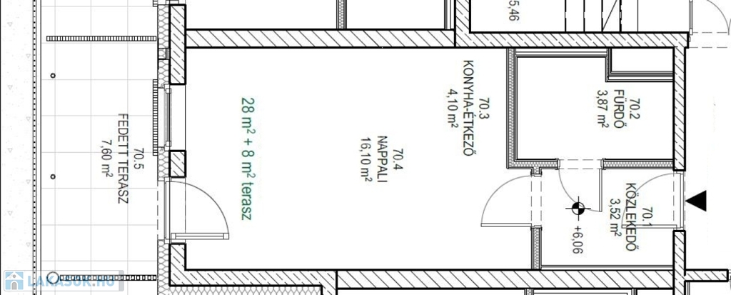 Ez a garzonlakás 28nm alapterületű+ tartozik hozzá egy 8nm-es fedett terasz is.
