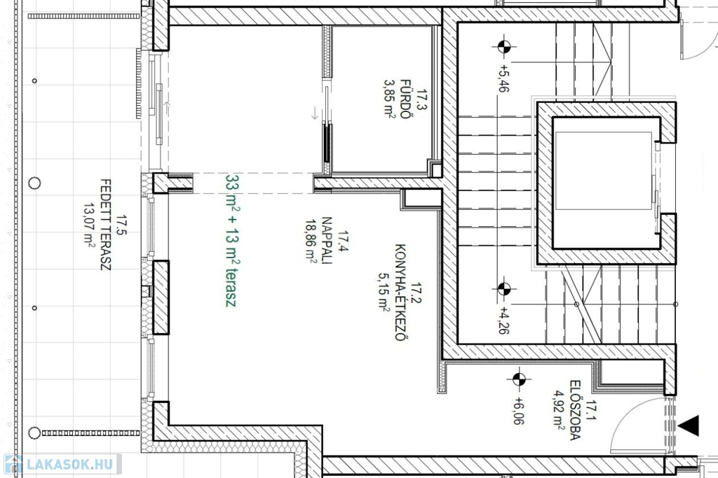 Ez a garzonlakás 33nm alapterületű+ tartozik hozzá egy 13nm-es fedett terasz is.