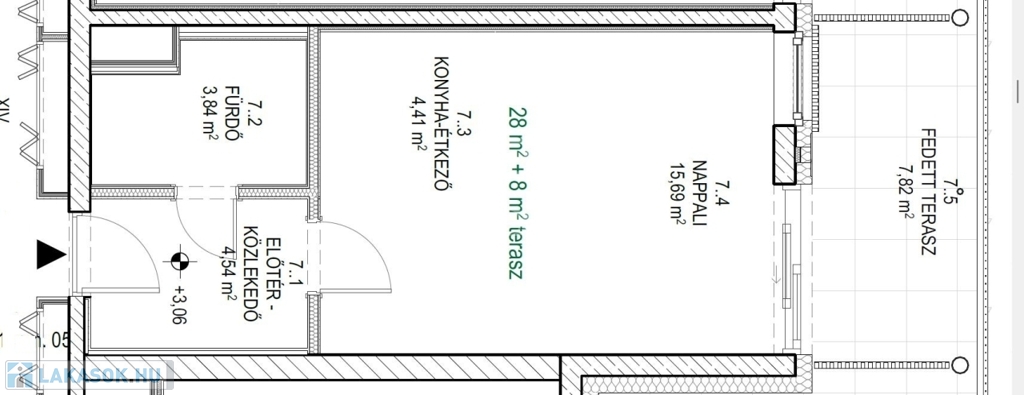Ez a garzonlakás 28nm alapterületű+ tartozik hozzá egy 8nm-es fedett terasz is.